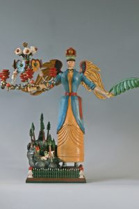 Verschiedene Herstellerfamilien werden vorgestellt und Besonderheiten erläutert. Hängeengel, Engel mit Leuchtern und Standengel aus verschiedenen Generationen zeigen, mit welcher Intensität sich die Erzgebirgler den Engeln gewidmet haben. Ein herausragendes Beispiel ist sicherlich ein berühmter erzgebirgischer Engel mit einem Leuchter und Paradiesgarten aus der Hand von Karl Louis Härtel, der lange im Verborgenen war und nun aufwendig restauriert im alten Glanz erstrahlt.