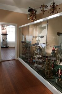 Dem wohl am Weitesten verbreiteten Weihnachtsschmuck aus dem Erzgebirge widmet sich das Pyramidenzimmer. In diesem volkskünstlerischen Erzeugnis vereinen sich die verschiedensten Traditionszweige. Christlicher Glaube, Bergmannsarbeit und Spielzeugherstellung finden in den Weihnachtspyramiden einen gemeinsamen Nenner.