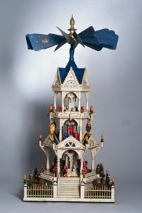 Anfang des 19. Jahrhunderts begann der Zauber der lichtgeschmückten, mit Warmluft betriebenen Pyramide, wobei ihre Wurzeln nahezu bis in das 17. Jahrhundert zurückreichen. Aufgeblüht ist die Pyramidenkunst dann in der zweiten Hälfte des 19. Jahrhunderts und brachte in jener Zeit etliche individuelle Formen hervor, die sich in den Familien Jahr für Jahr verändert haben. Dieser Vielfalt sucht die Ausstellung Rechnung zu tragen und zeigt Pyramiden verschiedener Formen, teilweise mit Zinnteilen verziert, mit unterschiedlichen Wärmequellen als Antrieb sowie mit Figurensätzen ganz unterschiedlicher Entstehungszeiten bestückt.