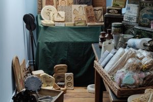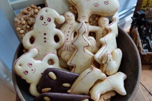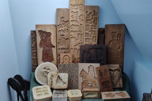 Pfefferkuchen-Ausstecher, Lebkuchen- und Spekulatius-Modeln, Marzipan- und Schokoladen-Formen sowie ein Stollenbrett stehen für das Gebäck der wohlhabenderen Gegenden.
